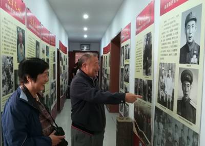 原南通市副市长、南通市人大常委会副主任崔印能在南通市新四军后代分会副会长任鹰陪同下参观《父辈足迹》展览。