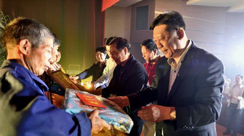 有关领导分批向新四军抗战老兵、部队立功现役军人家属、困难转复军人代表发放荣誉状、慰问金、慰问品。