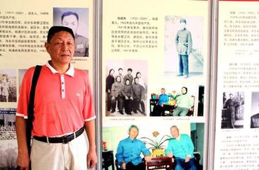 南通爱国拥军基金发起人张志光在父亲张鹤年图片介绍前留影