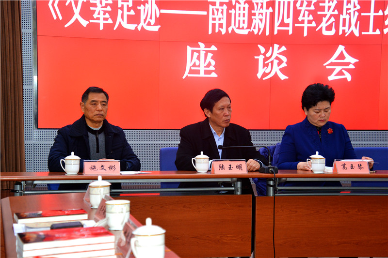 12月21日上午,我市在市行政中心第二会议室举行《父辈足迹——南通新四军老战士纪念文集》座谈会,缅怀革命先烈,弘扬铁军精神。市委常委、宣传部长陆卫东参加会议并讲话。市人大常委会副主任、市总工会主席葛玉琴,市委原书记朱剑、副书记李明勋,市政协原副主席、市新四军研究会会长陆玉明等自始至终参加会议,并向市档案局、总工会、团市委、关工委、图书馆、南通大学文学院等单位赠送了纪念文集。市直有关部门领导,市新四军研究会后代分会成员,南通大学文学院师生代表等70余人参加了座谈会。